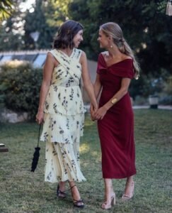 Vestido largo o midi y zapatos de taco grueso para mayor comodidad en el césped.
